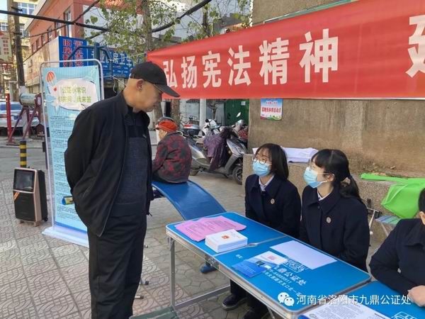 2021年12月4日是第八个国家宪法日,为深入贯彻习近平法治思想以及党的十九届六中全会精神,推动宪法知识的进一步普及,增强群众法律意识,构建法治、文明的社会秩序,12月4日,洛阳市九鼎公证处深入社区、公园开展以“弘扬宪法精神建设法治中国”为主题的国家宪法日普法宣传活动。